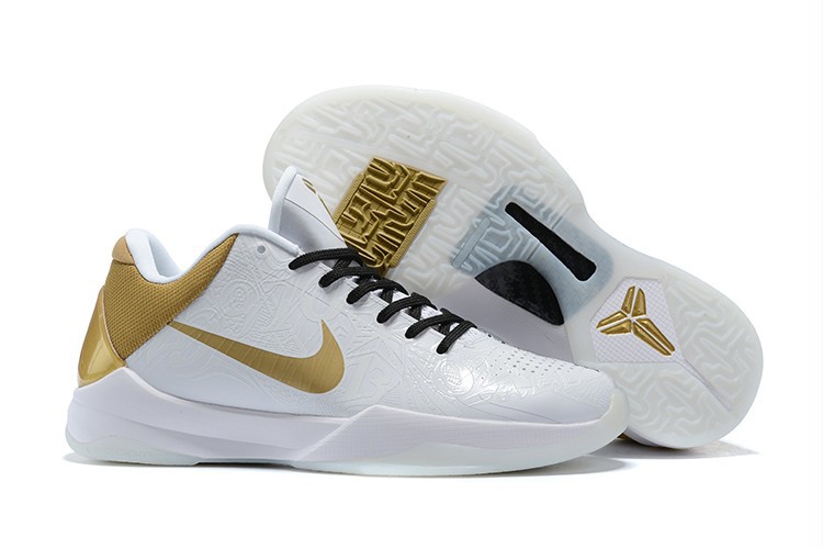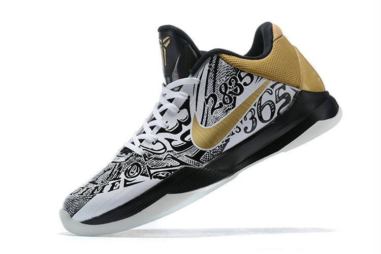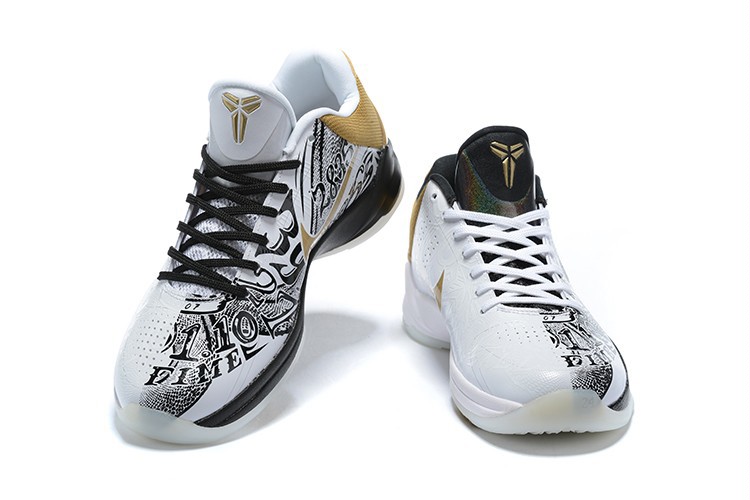 Новые Kobe 5 Protro получили так называемый сплит-дизайн — внутренняя и внешняя часть кроссовка отличаются. Одна половина чистая, практически вся белая, а вторая — с черно-белым принтом. Также стоит отметить контрастирующие золотистые элементы в «свуше» и заднике.